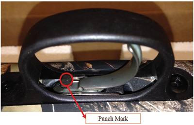 VERIFICA DELL'AZIONE CORRETTIVA: Alla restituzione dell'arma, si potrà notare la presenza di un punzone sul tasto di sblocco dell'otturatore (vedere Figura 3). Questo punzone conferma che la carabina è stata ispezionata e il suo gruppo scatto ripulito/sostituito nell'ambito di quest'azione di richiamo.